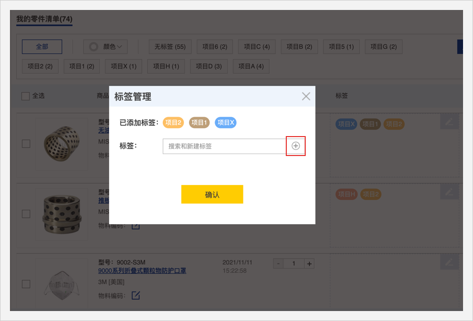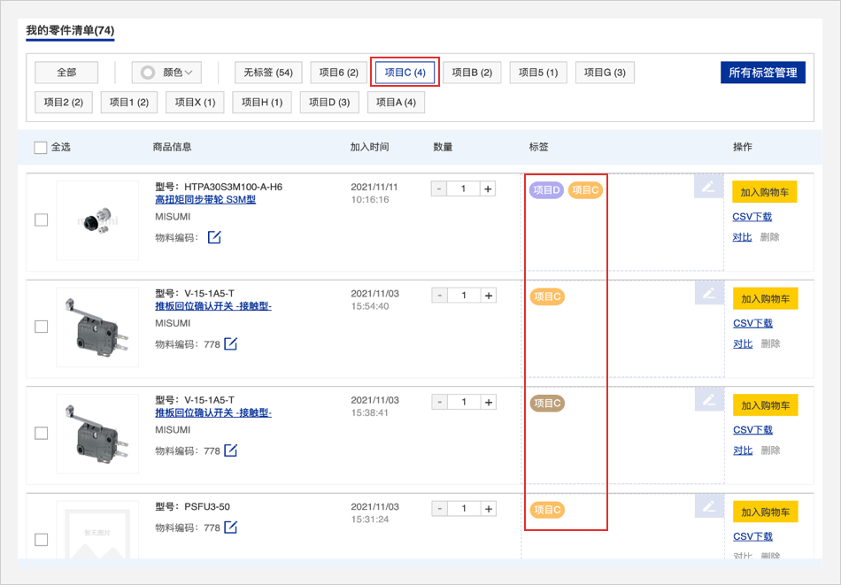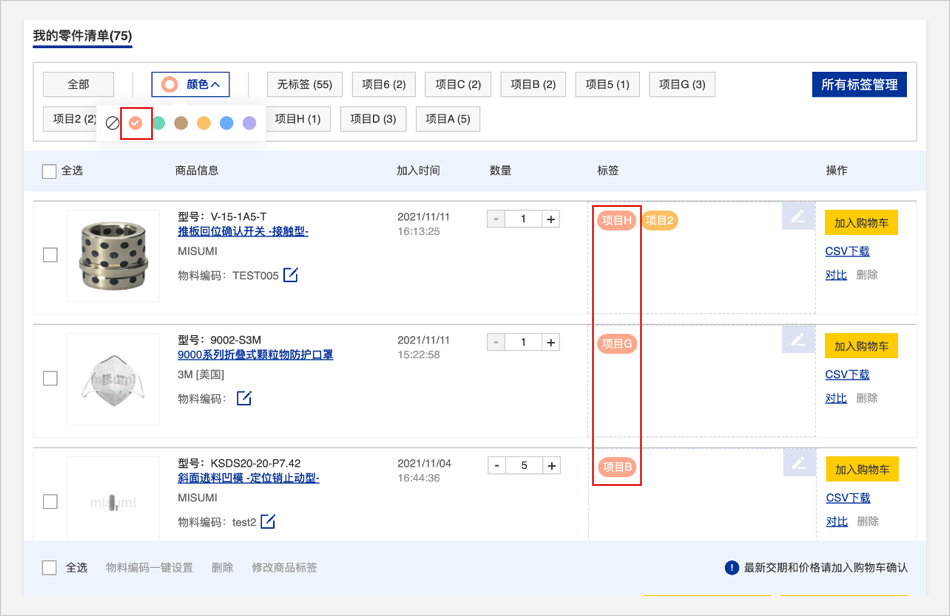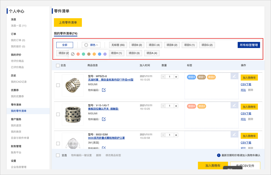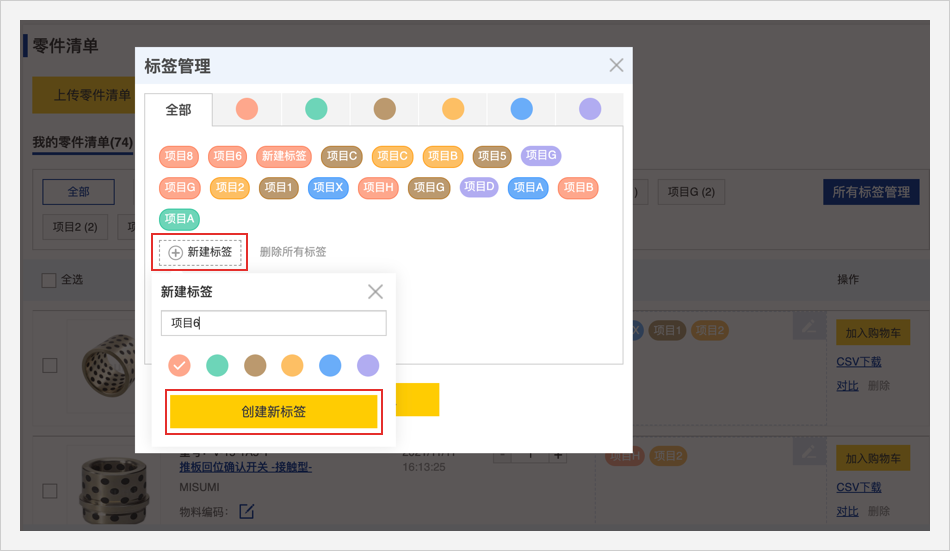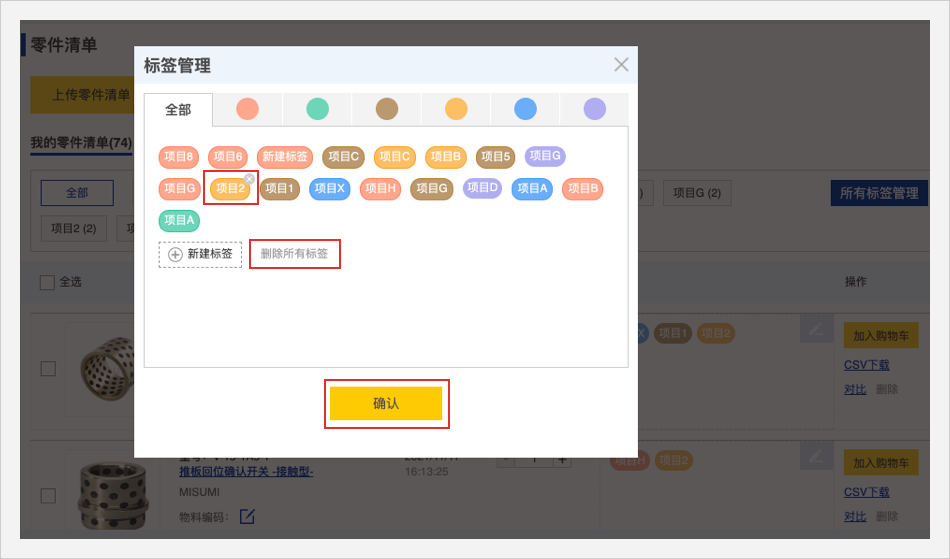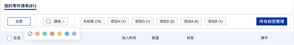 零件清单头部的标签管理栏可以用颜色或者文字筛选查看商品