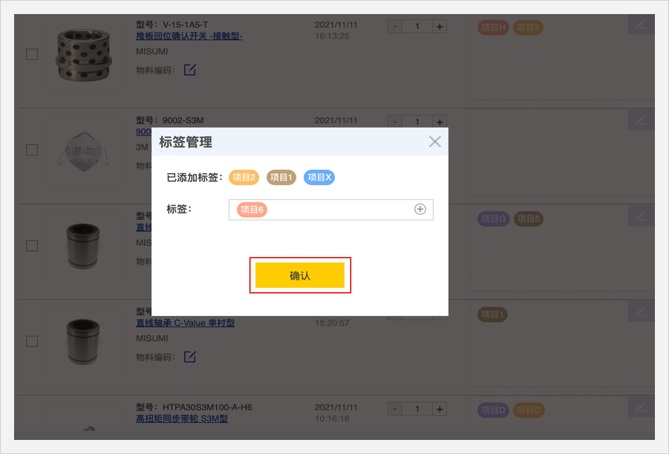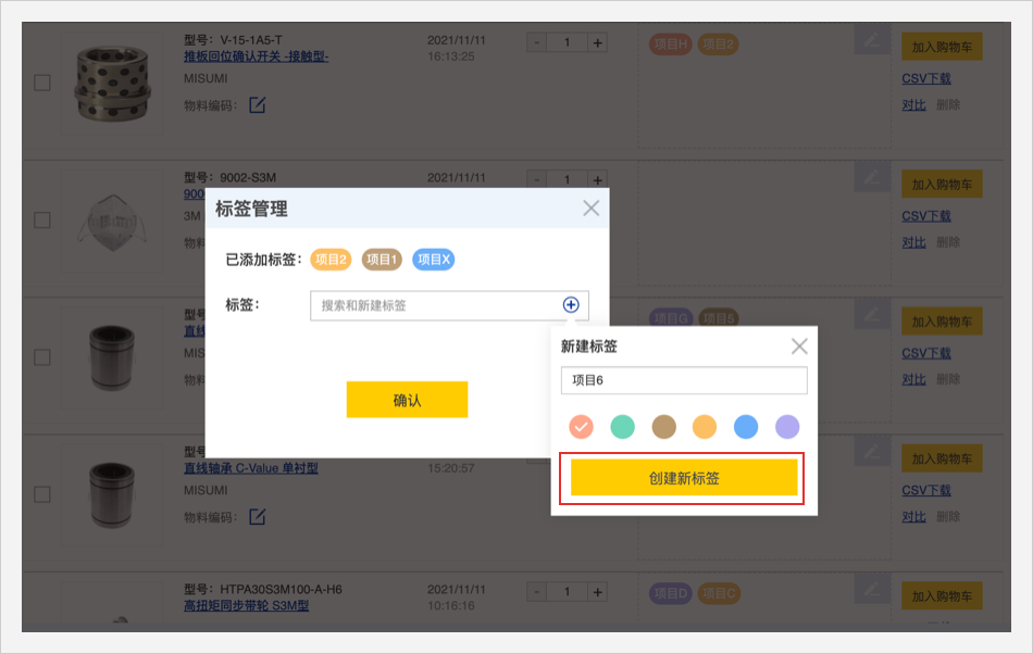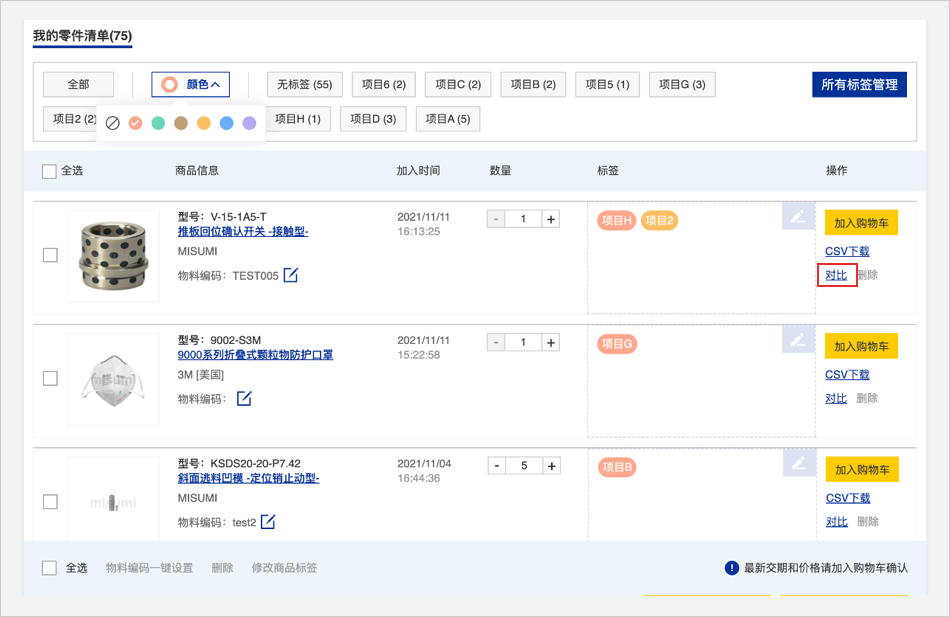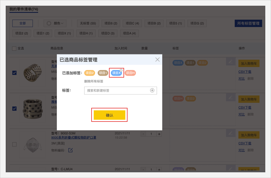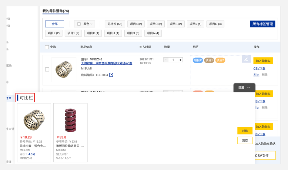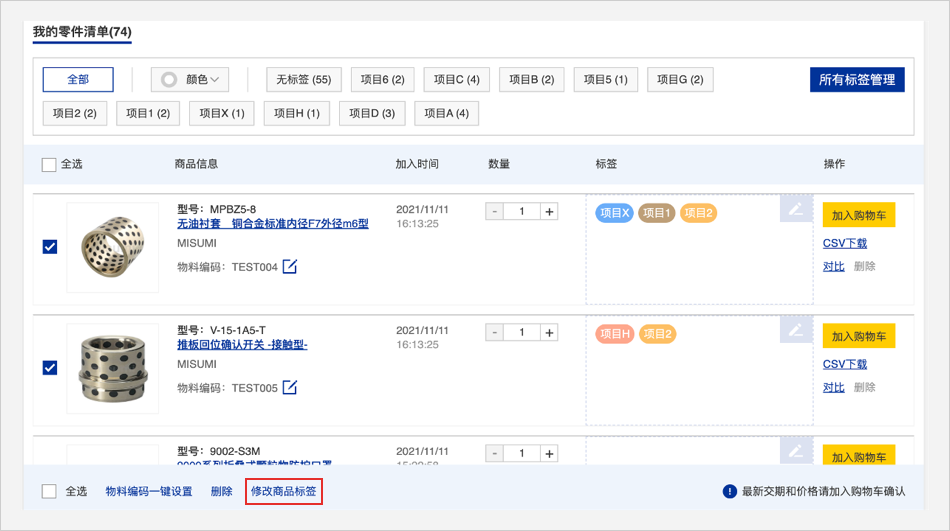零件清单头部的标签管理栏可以用颜色或者文字筛选查看商品