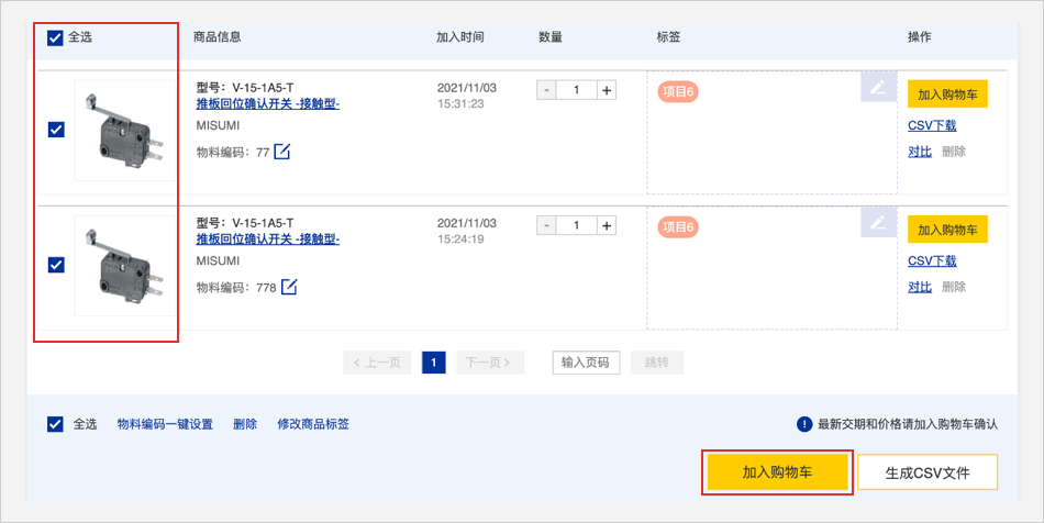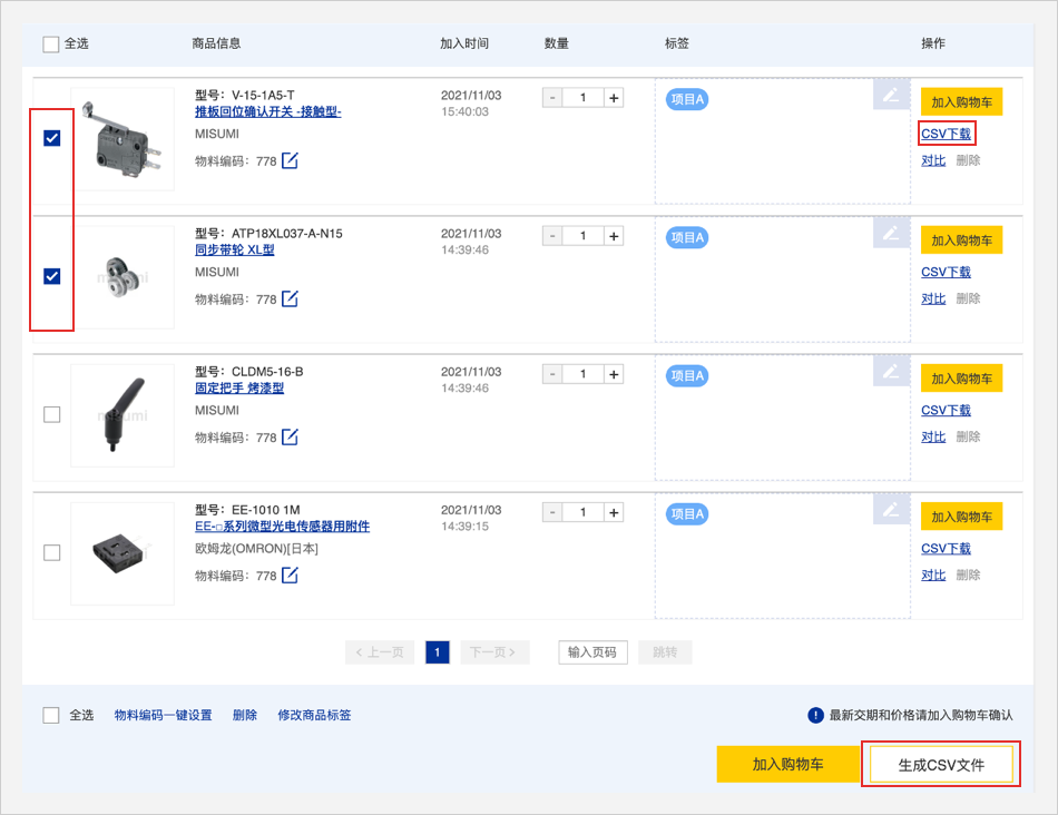 选择多个商品点击底部【生成CSV文件】可批量下载CSV文件