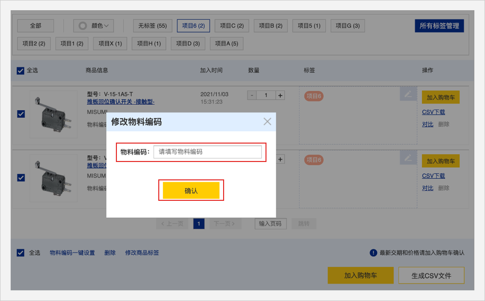 选择需要编辑物料编码的商品,点击【物料编码一键设置】输入物料编码【确认】即可