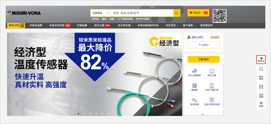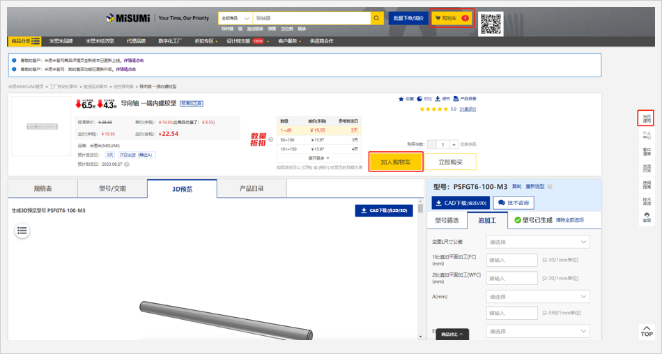 2.有米思米型号:直接在官网首页点击【批量订购/报价】按钮进行询价/订购。