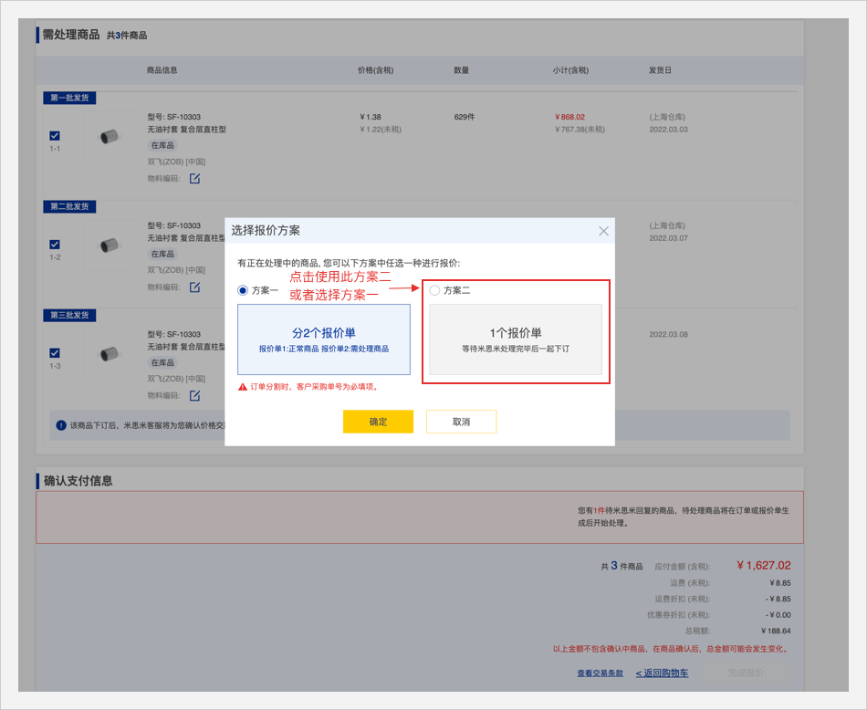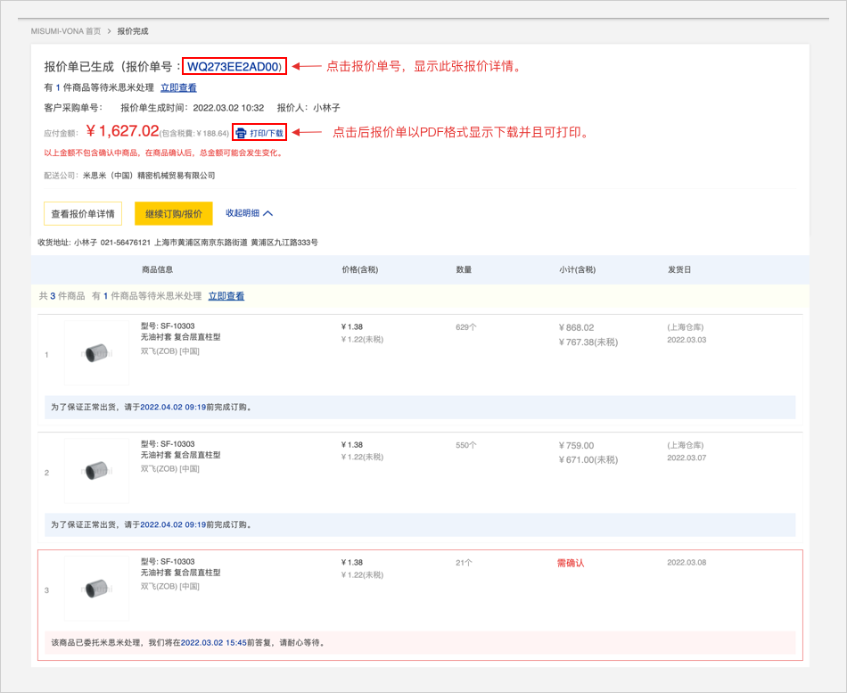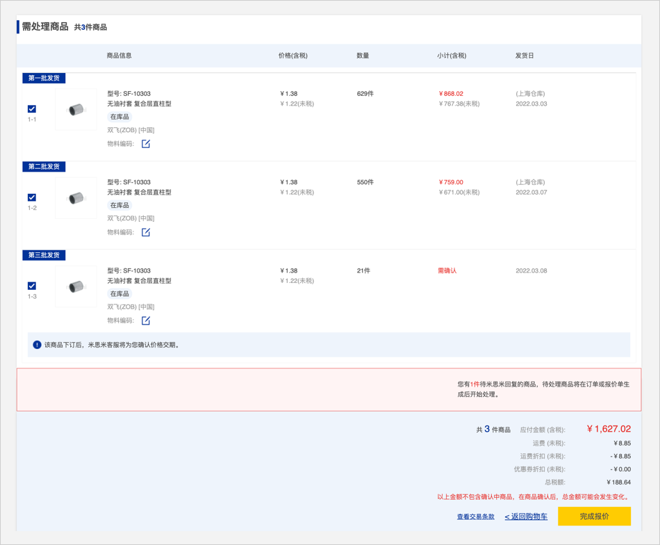 报价单中有需要确认的商品时,请按照相应的提示信息进行逐个操作。修正完毕,点击【完成报价】,将更新报价单信息。如未能正确修正时,将再次显示本页面。如需米思米帮助解决,请勾选【如需米思米帮您解决,请勾选后提交。】,并点击【完成报价】继续提交。