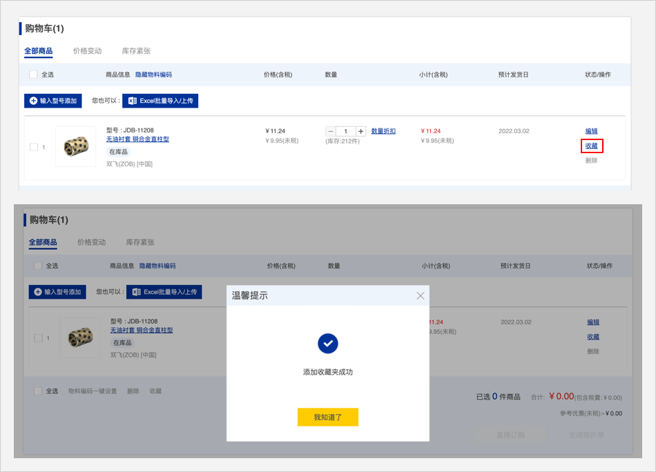 您可将经常使用的商品添加到我的收藏夹,下次报价或订购时,在零件表中就能查到这些型号。