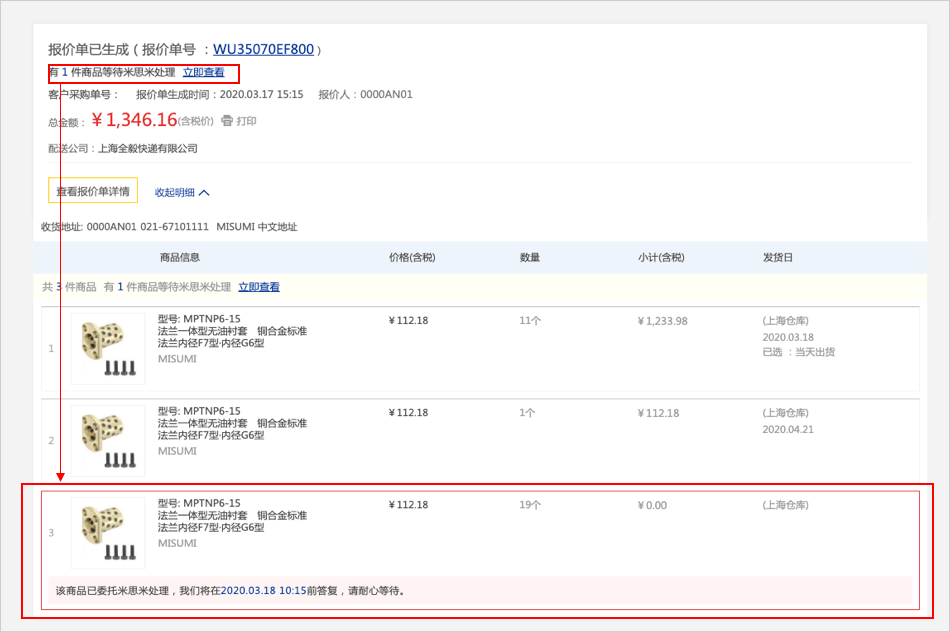 有1件商品等待米思米处理,我们将在2020.03.18.10.15前答复,请耐心等待,可点击【立即查看】页面跳转到商品详情。