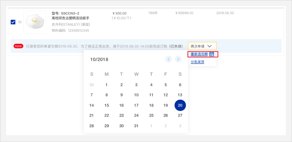 【订购】交期时间失效 重新选择交期