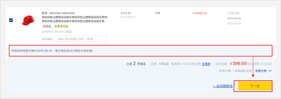 页面跳转到订单确认页,新的交期已确定。米思米将在您订购成功后为您处理。点击【下一步】进入订购确认页面。