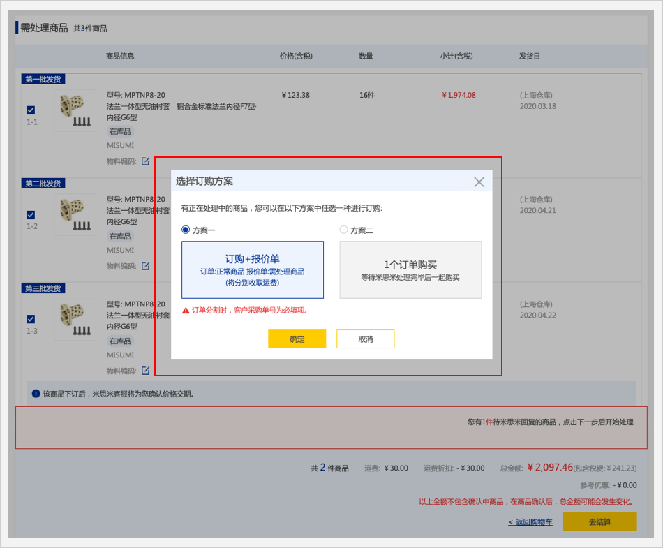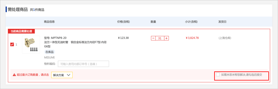 在报价单确认页面中,商品数量超过最大订购数量,您可以【如需米思米帮您解决,请勾选后提交】,勾选后点击【去结算】,跳出弹窗。