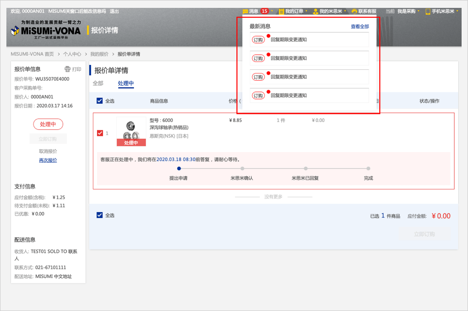 可根据米思米提供的新交期【使用此方案】或【再次申请】,如果选择【使用此方案】unfit商品处理完成,页面自动跳转到报价单确认页面。