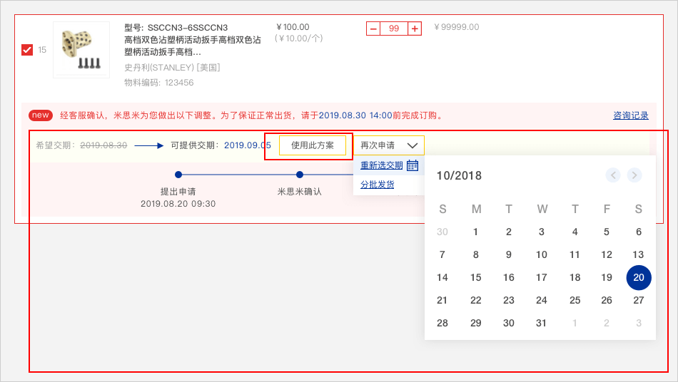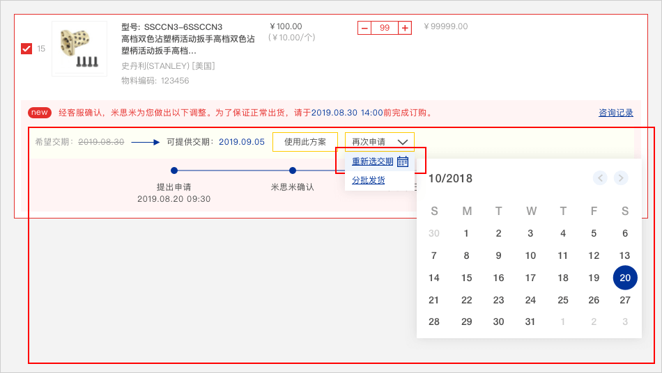 可根据米思米提供的新交期【使用此方案】或【再次申请】,如果选择【再次申请】下拉内容,选择【重新选交期】可选择指定交期时间,报价单确认付款后米思米收到订单,将会在工作日时间为您处理订单;