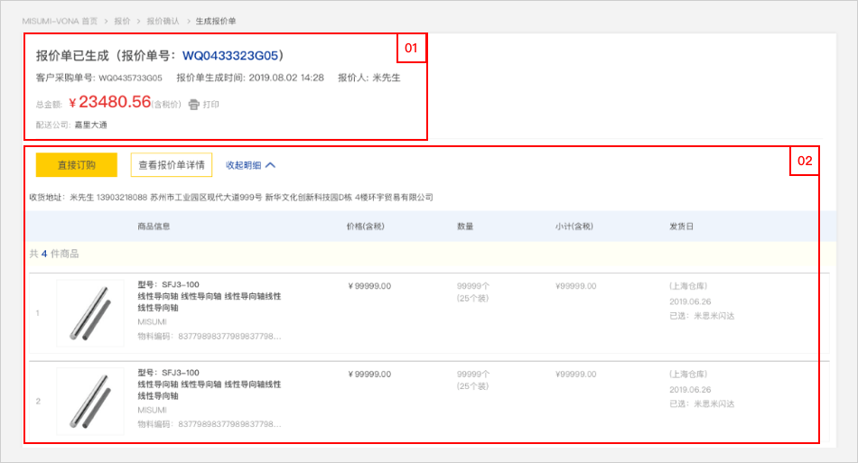 2.确认报价单详情信息:查看报价商品详细信息。点击【直接订购】报价单转订单