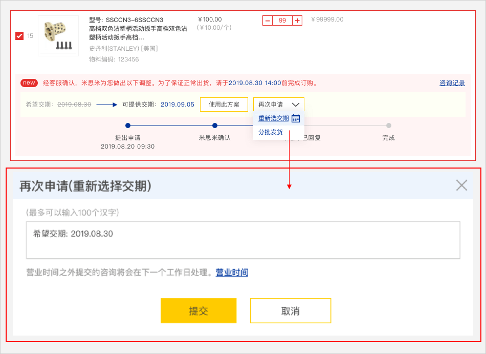 如果选择【再次申请】下拉内容,选择【分批发货】跳出再次申请弹窗,可输入您希望的最新交期,点击【确定】等待米思米回复。