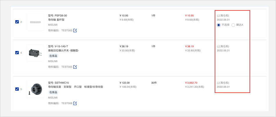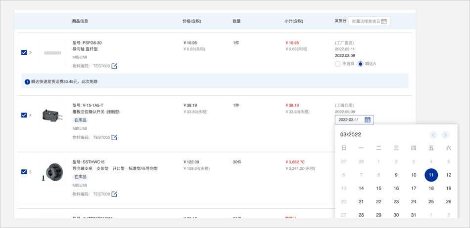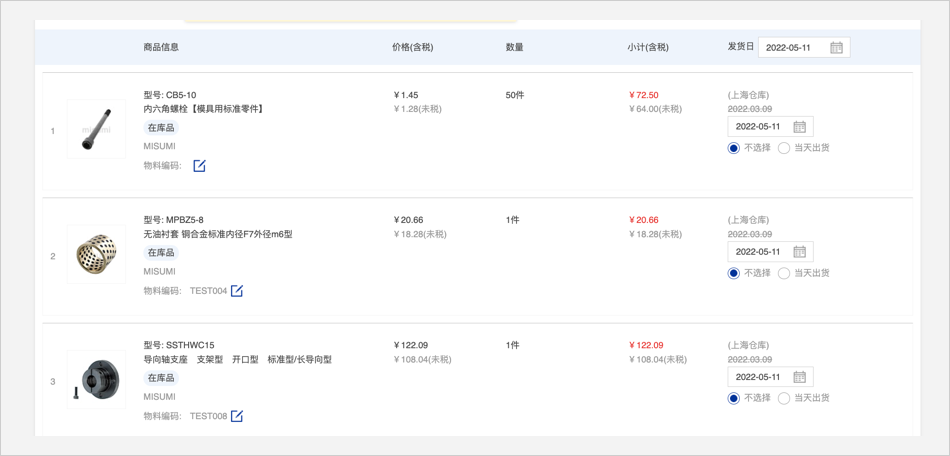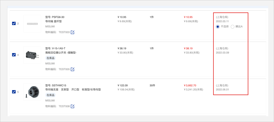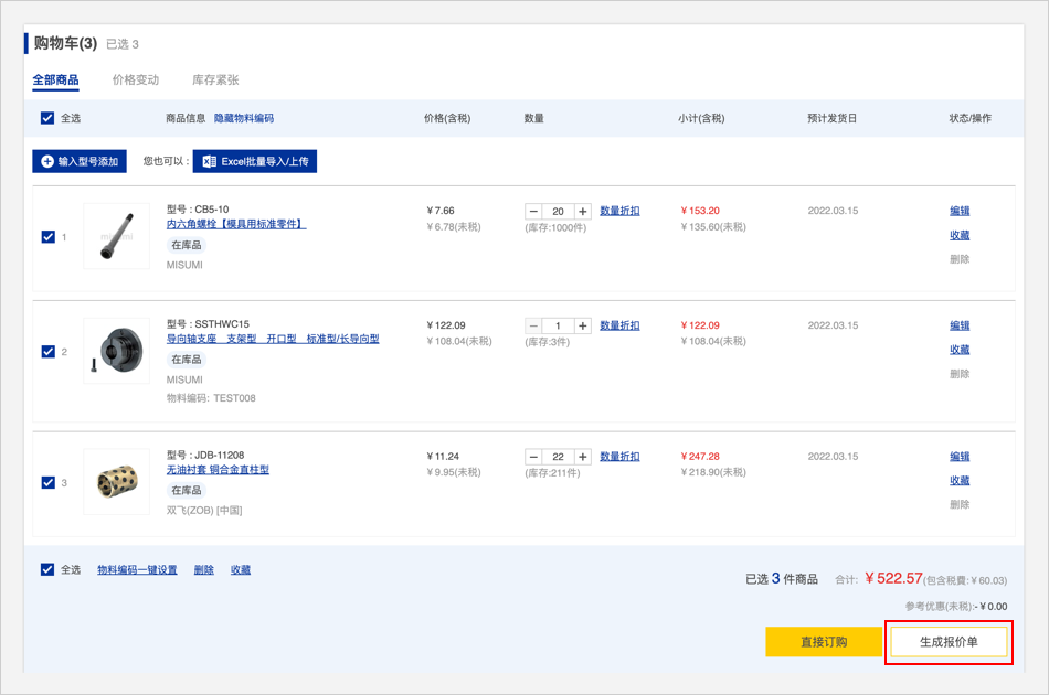 2.有米思米型号:直接在官网首页点击【批量订购/报价】按钮进行询价/订购。