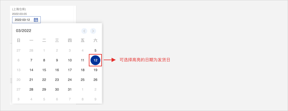 请选择可点击的日期来指定发货日。
