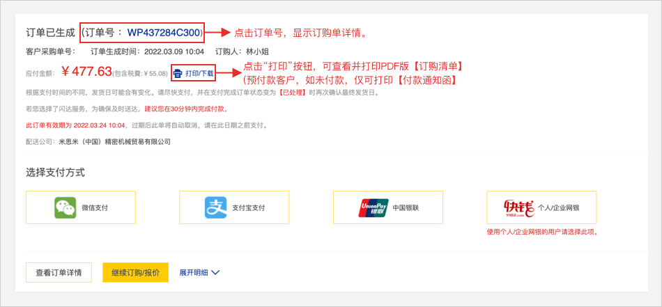 如需打印订购清单,请点击订单号右侧的【打印】按钮。