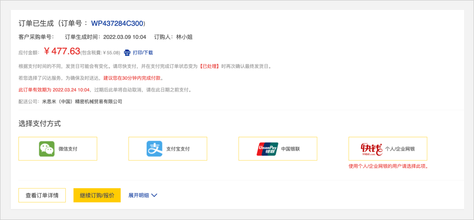 在线支付的订单需要全额支付后方可正式订购完成。