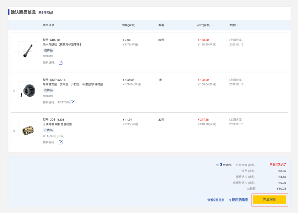 生成报价单后确认商品信息点击【完成报价】