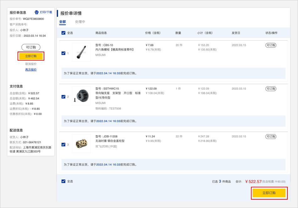 在报价单详情页面点击【立即订购】或者侧边栏点击【立即订购】进入订购确认页面