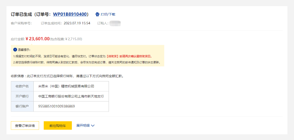 如果您的支付方式为银行转账,在订购完成页面会有银行转账信息提示,请按所示含税总金额100%汇款至米思米银行账户。