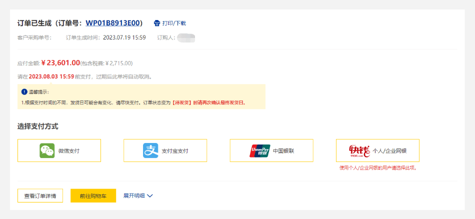 如果您的支付方式为在线支付,请选择支付方式后完成订购。