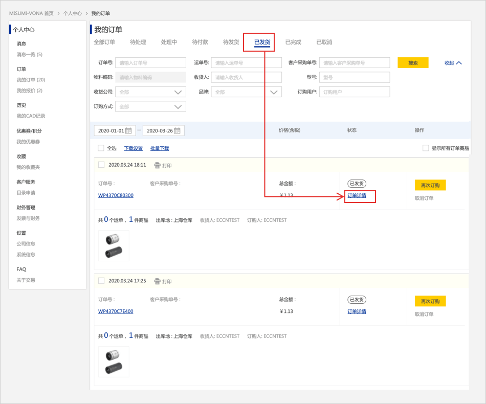 在网站首页顶部点击【我的订单】,页面跳转到 订单页面。