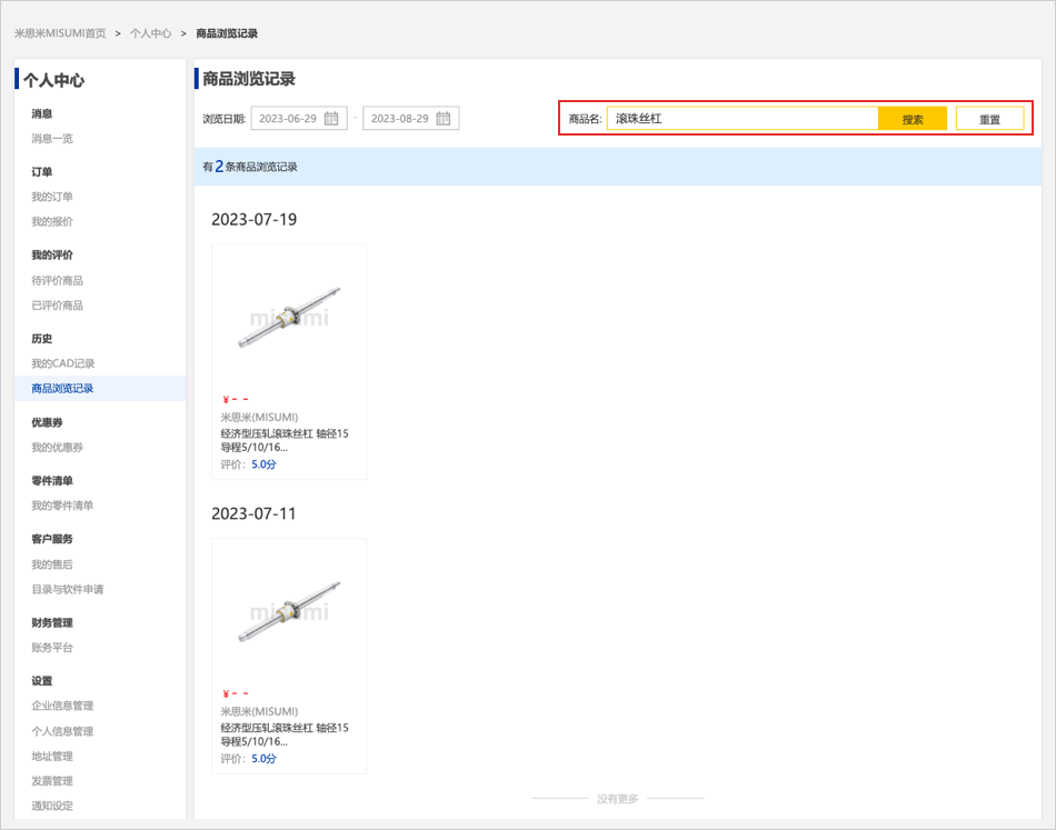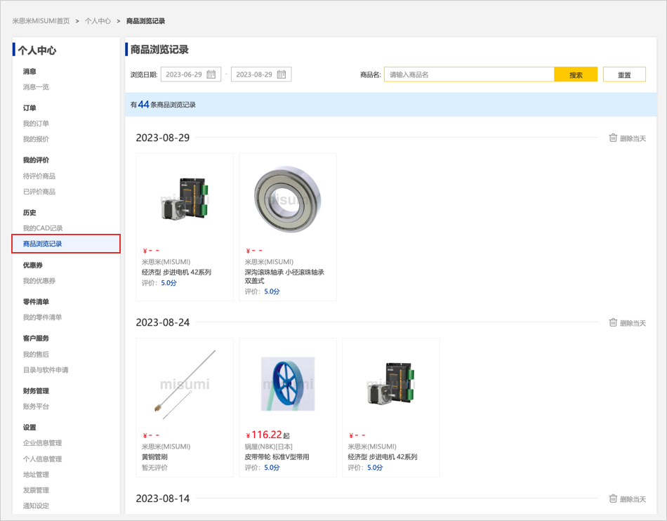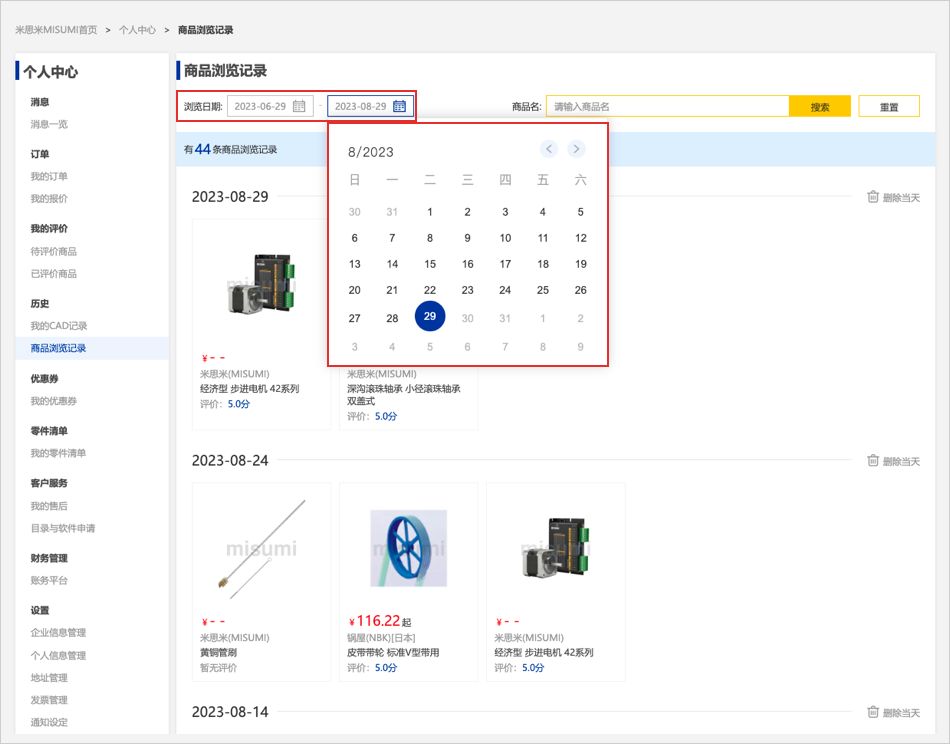 指定期间时,点击画面左侧【浏览日期】后的日历栏,选择开始日(左侧的日期)和结束日(右侧的日期)。即可查看该期间内商品的浏览记录。