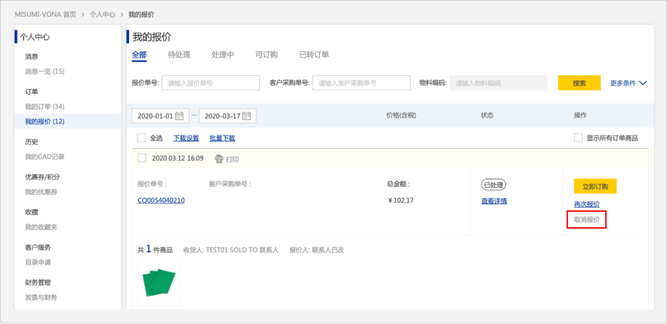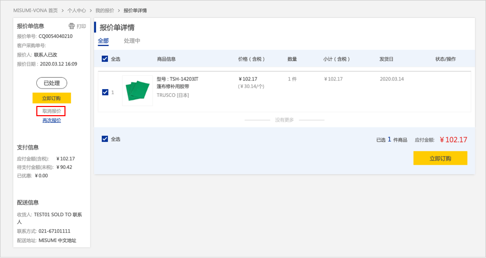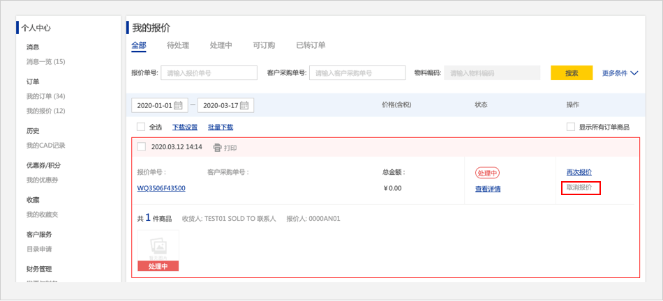 在报价详情页面,【已处理】的商品,点击【如何取消报价单】,页面跳转到报价历史页面再次点击【如何取消报价单】该报价则被删除。