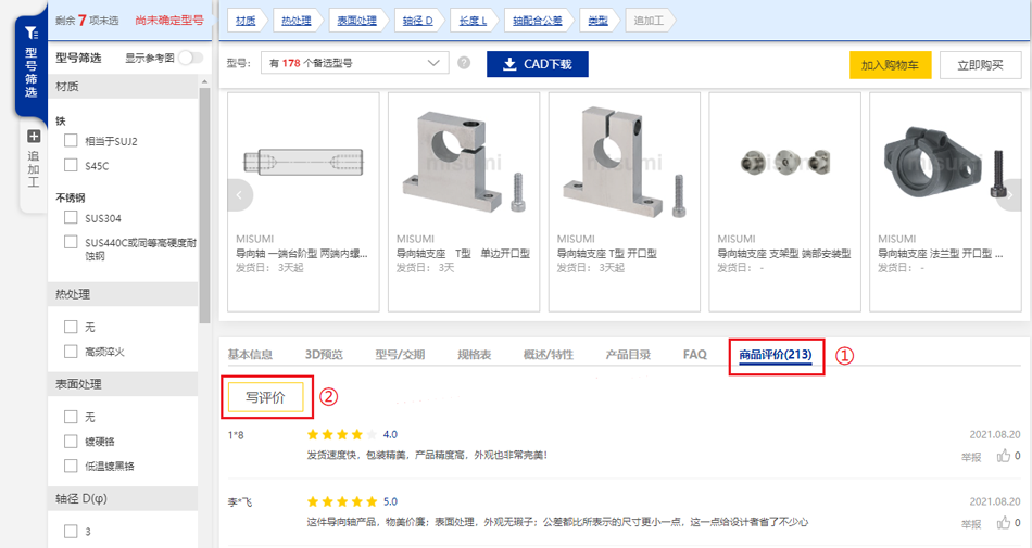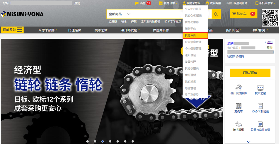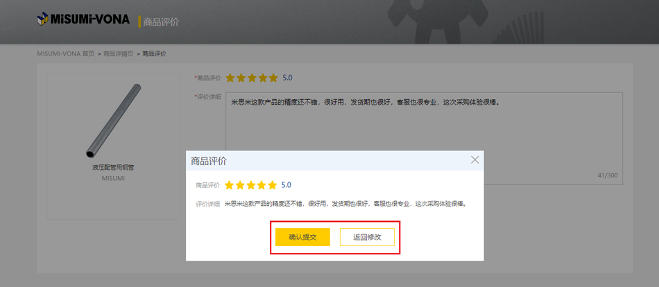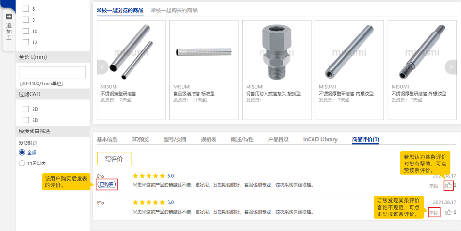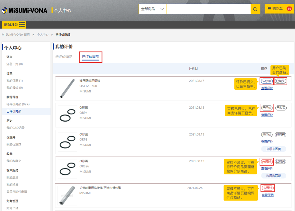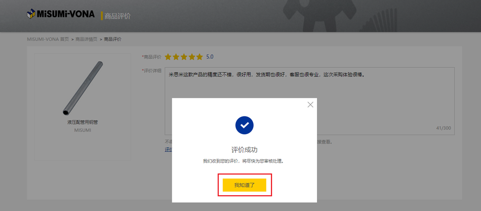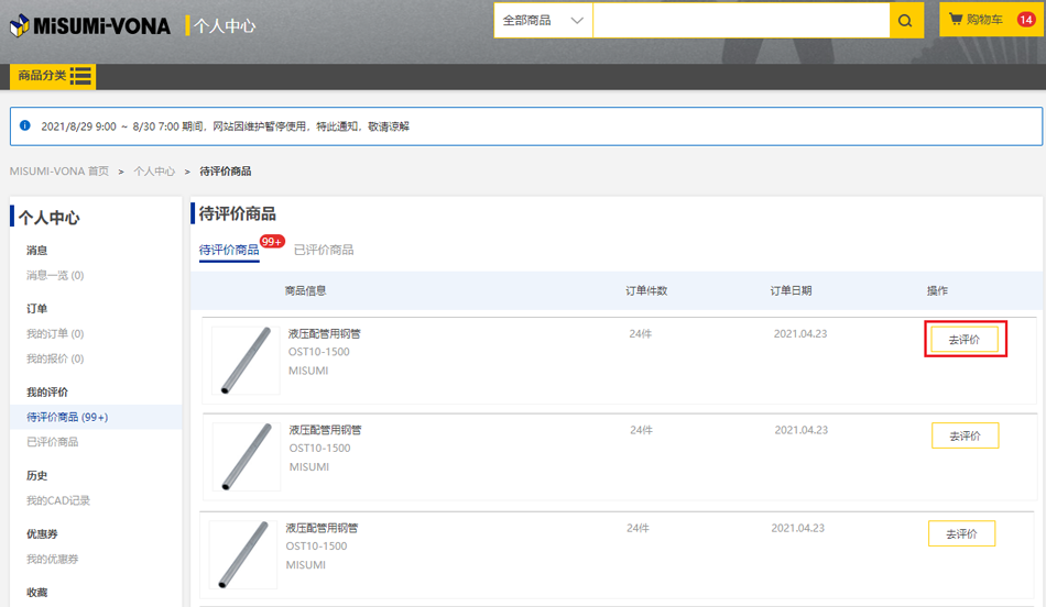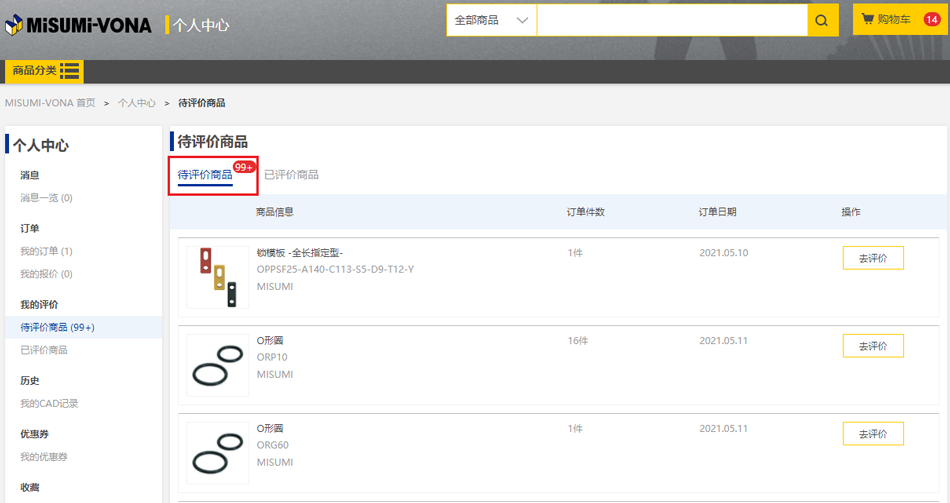 1.入口一:登录米思米账号,点击米思米官网首页【我的米思米】-【我的评价】,进入待评价商品页面。