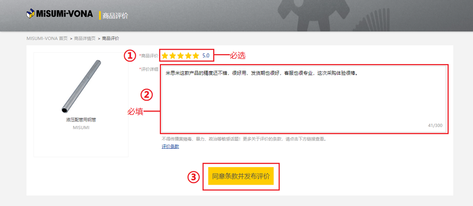 3.点亮【商品评价】右侧的星星(必选),并填写【评价详细】(必填),填写完毕后点击【同意条款并发布评价】。
