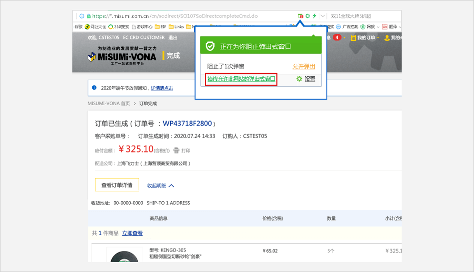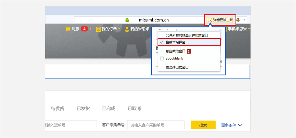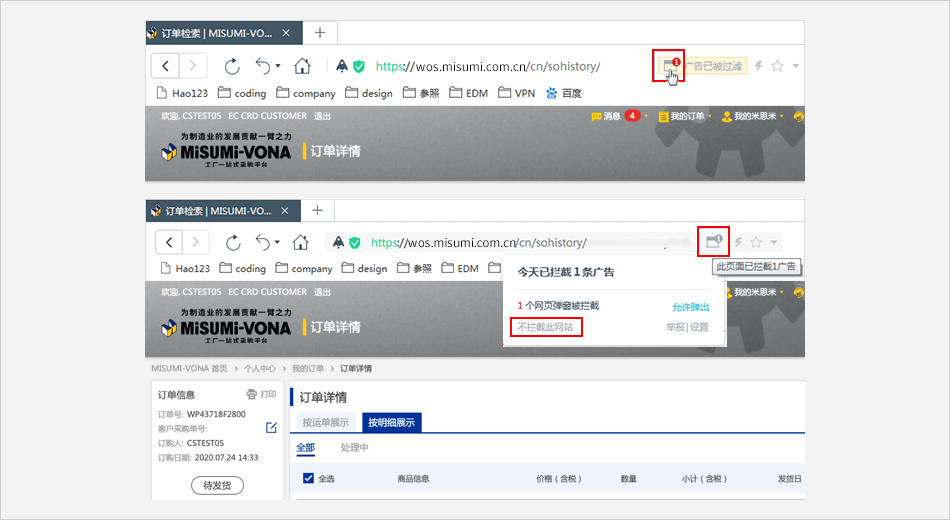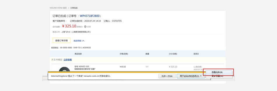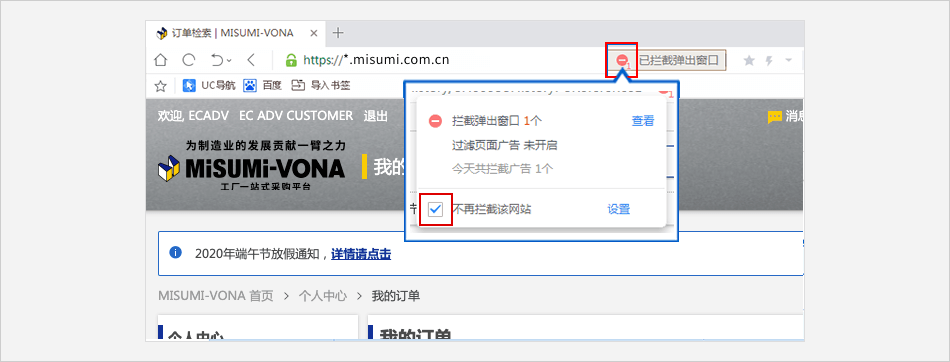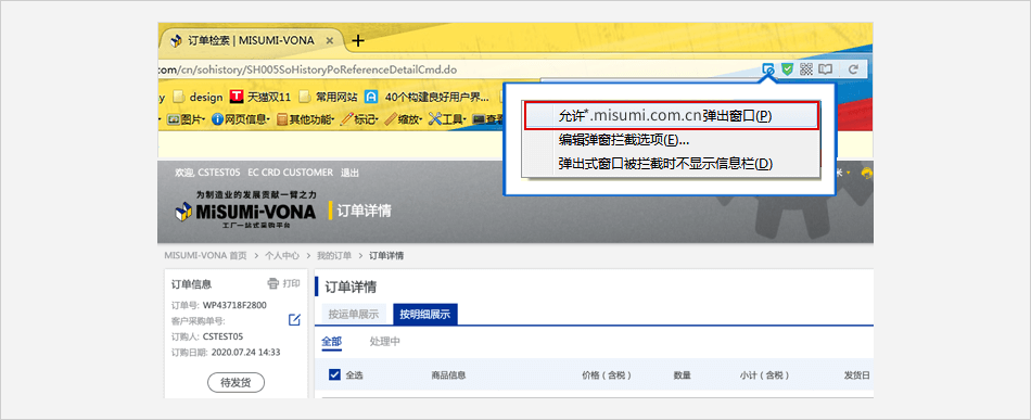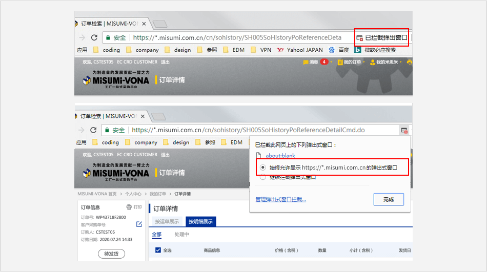单击浏览器地址栏框中的拦截标志 ⟹ 点击 【始终允许显示 https://*.misumi.com.cn 的弹出式窗口】 。