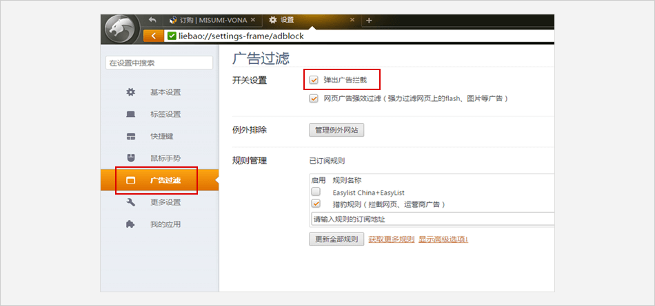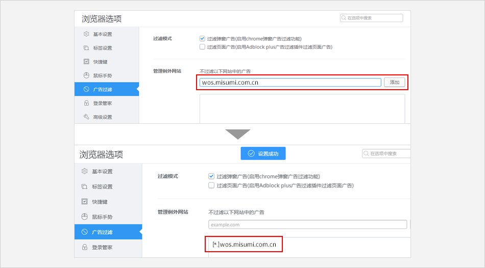 点击 【广告过滤】 ⟹ 在右侧的页面中 【管理例外网站】 的输入框中输入米思米网址:www.misumi.com.cn ⟹ 点击 【添加】。