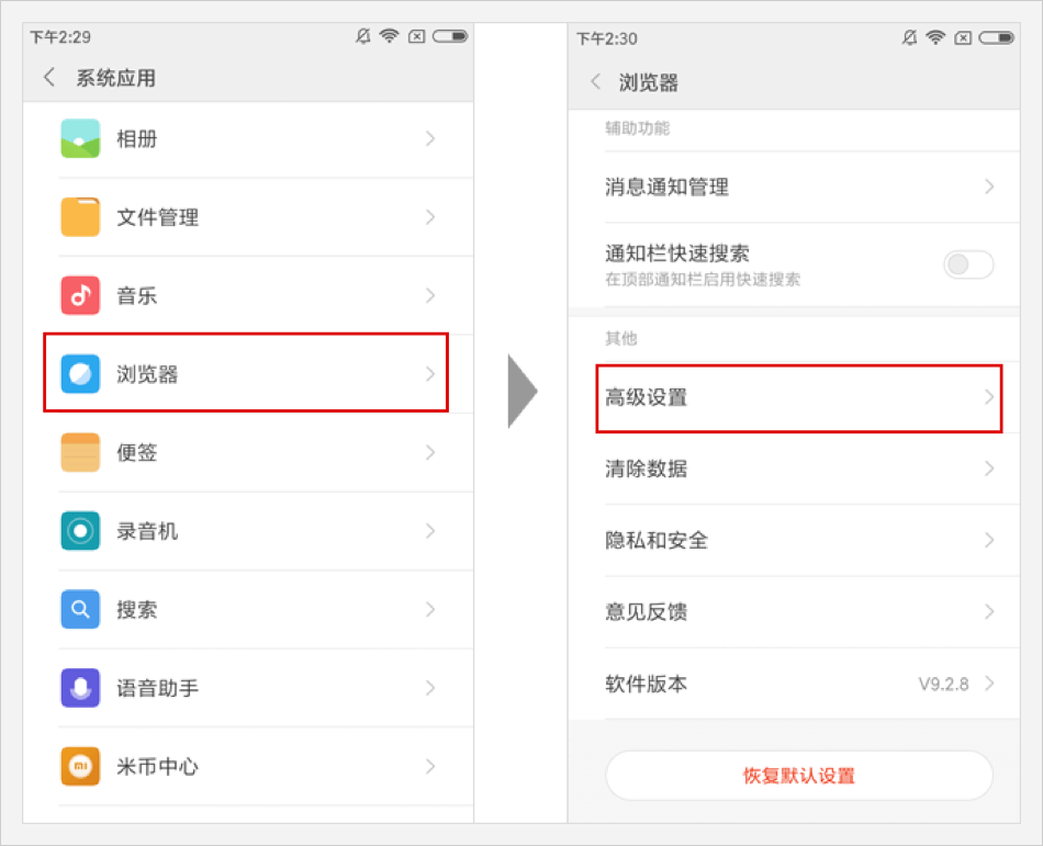 打开 【浏览器】 选项 ⟹ 点击并打开 【高级设置】 选项页面。