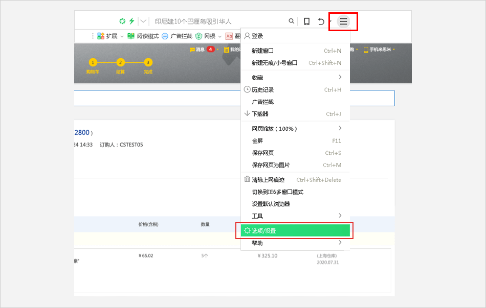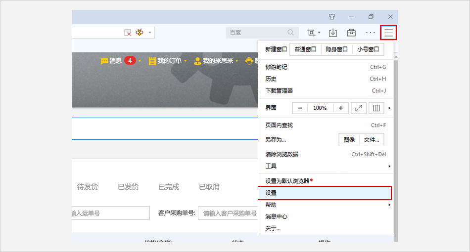 在浏览器菜单页面中进行设置
