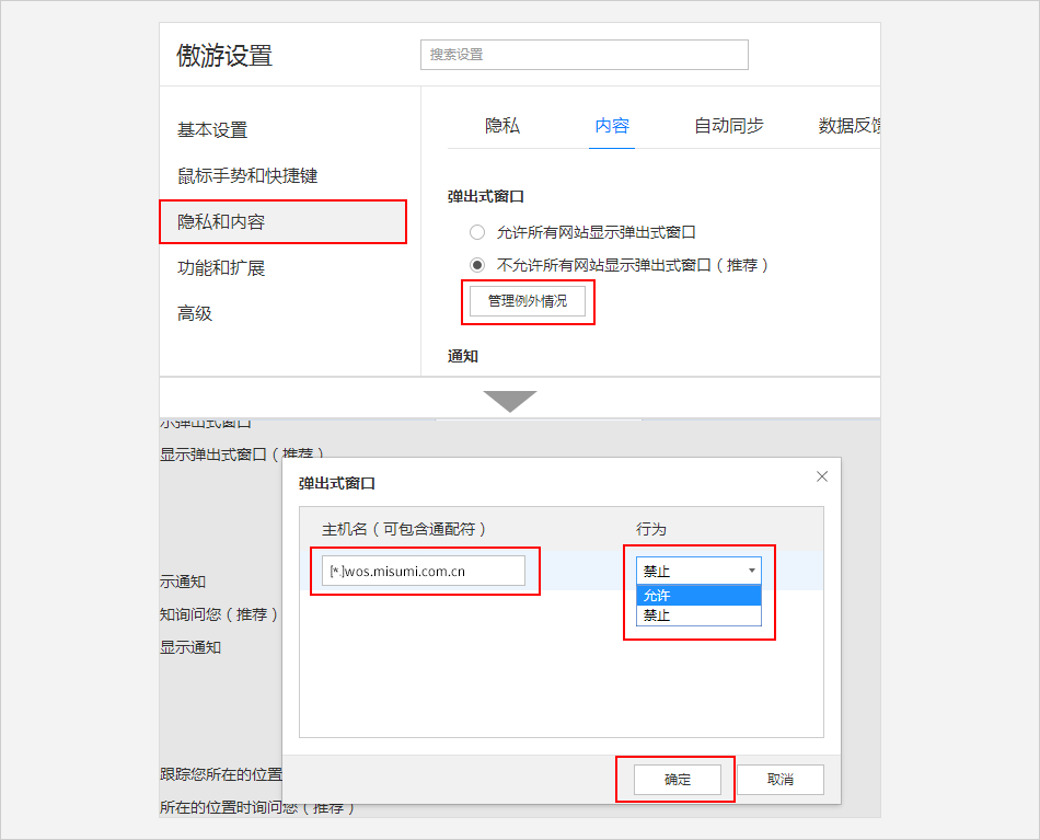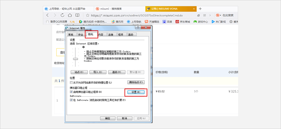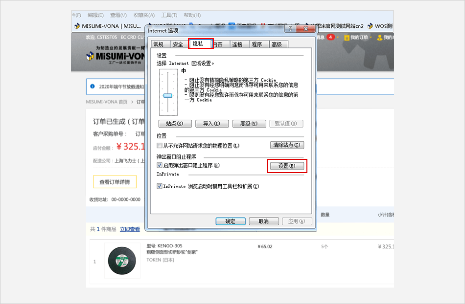 点击 【隐私和内容】 ⟹ 点击 【管理列外情况】 按钮⟹ 在弹出窗口页面中输入米思米网址:[*.]www.misumi.com.cn ⟹ 在行为下拉框中选择