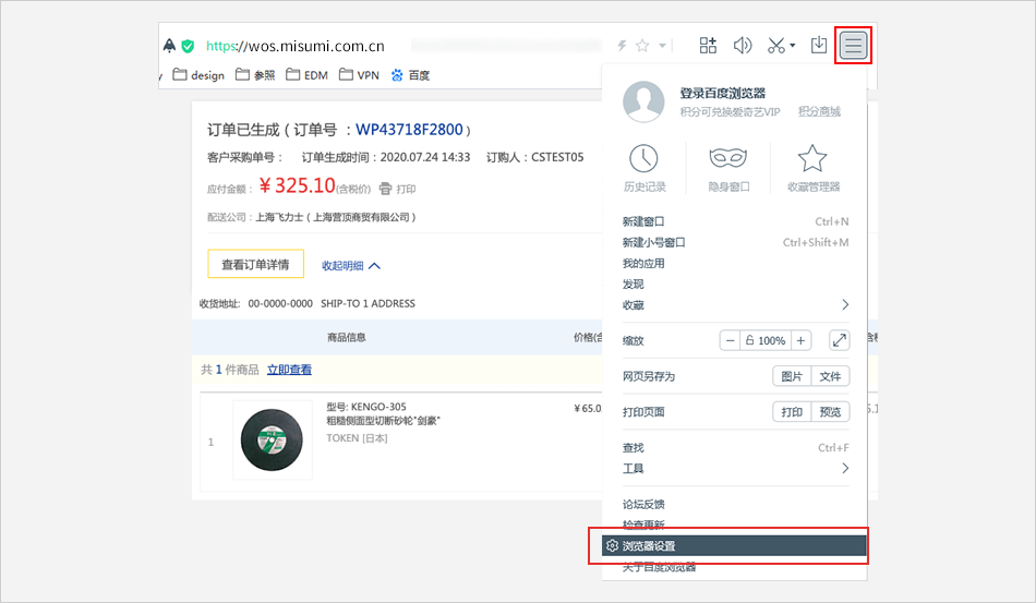 单击浏览器右上角的设置标志 ⟹ 点击 【浏览器设置】 选项。
