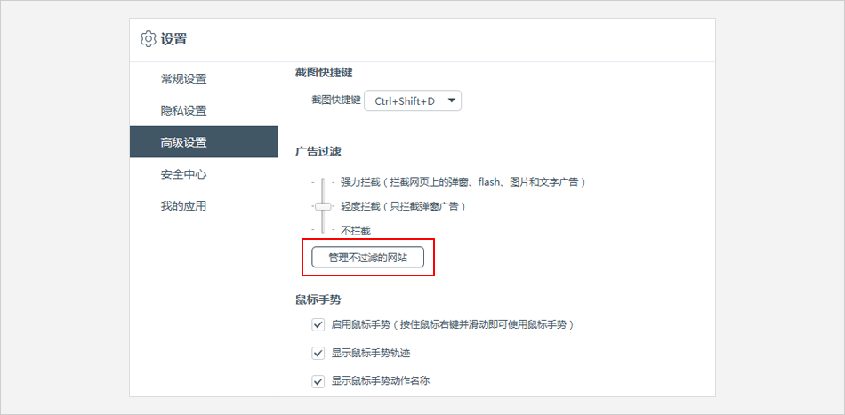 点击 【高级选项】 ⟹ 点击 【管理不过滤网站】 按钮。