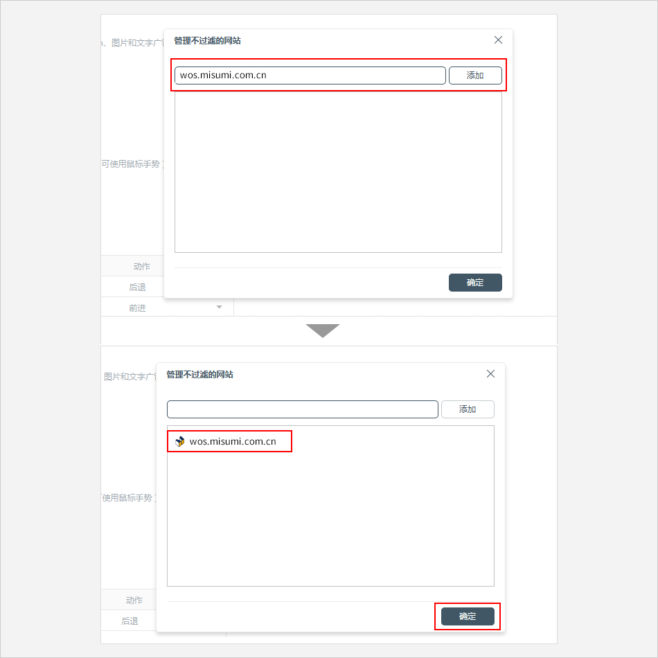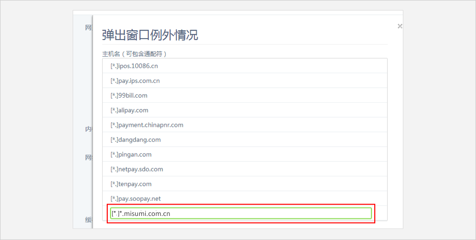 文本框内输入米思米网址:[*.]*.misumi.com.cn ⟹ 关闭设置页面。