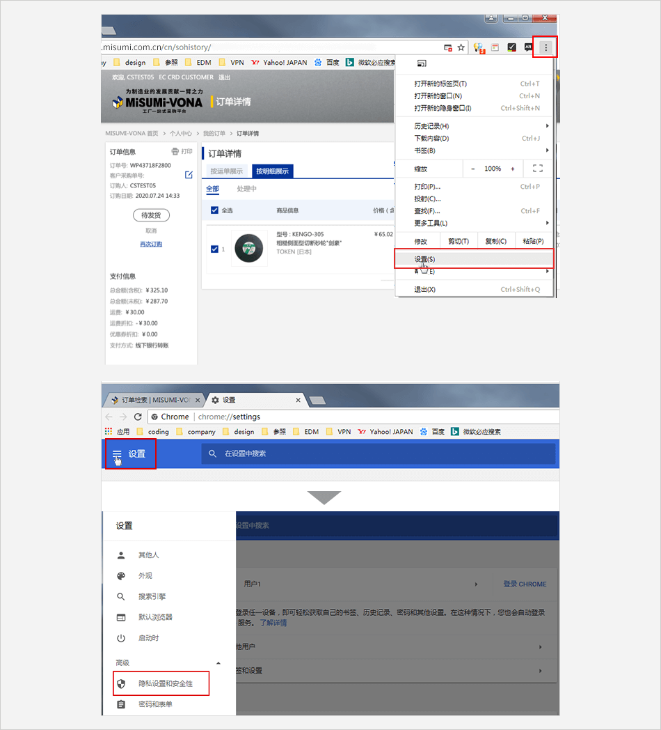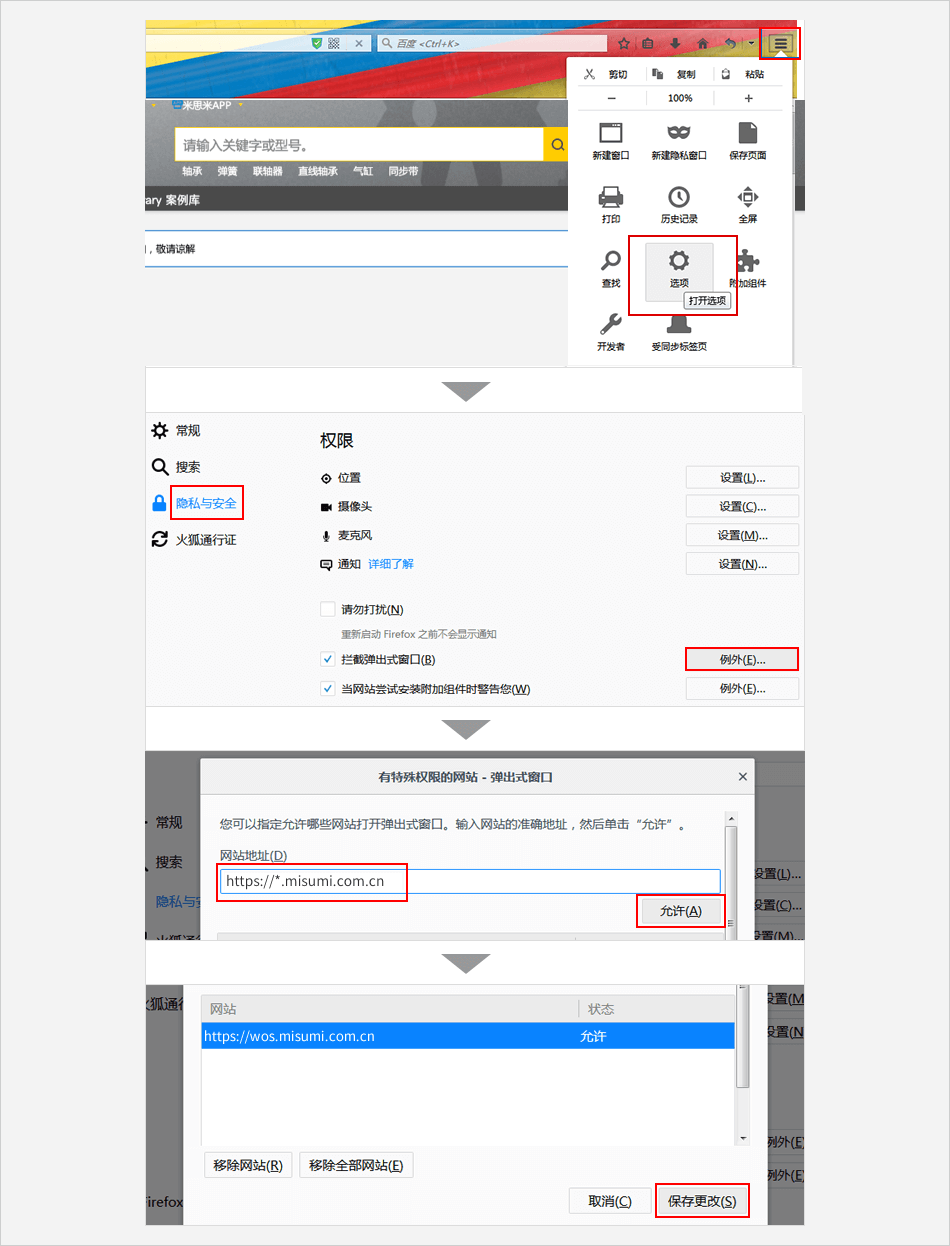单击浏览器右上角的菜单标志 ⟹ 点击【选项】⟹ 单击 【隐私与安全】 选项 ⟹ 在右侧的 “权限 ”选项内容,点击 “拦截弹出式窗口” 右侧的【例外】 按钮 ⟹ 在网址地址栏中输入米思米网址:https://*.misumi.com.cn⟹ 点击 【允许】⟹ 最后点击【保存更改】。
