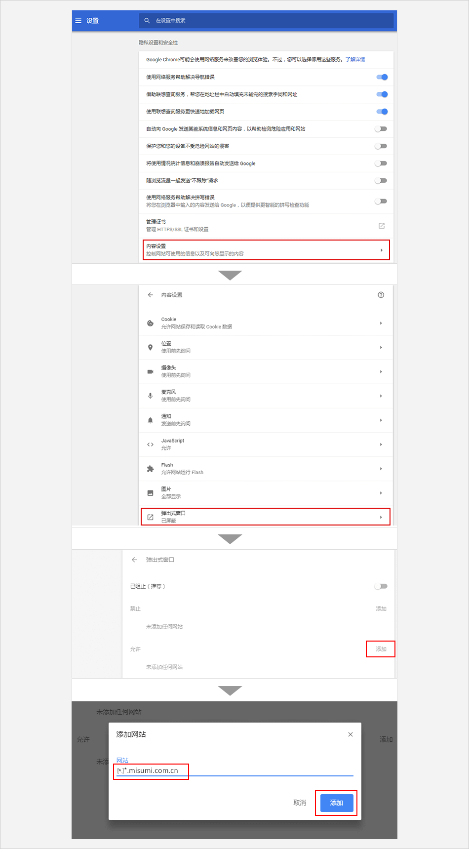 单击【内容设置】展开页面 ⟹ 点击 【弹出式窗口】选项⟹ 点击【添加】 ⟹ 输入米思米网址:[*.]www.misumi.com.cn ⟹