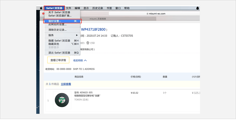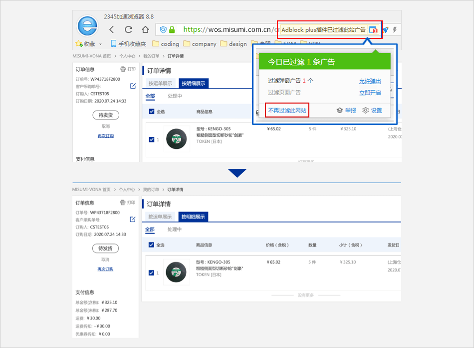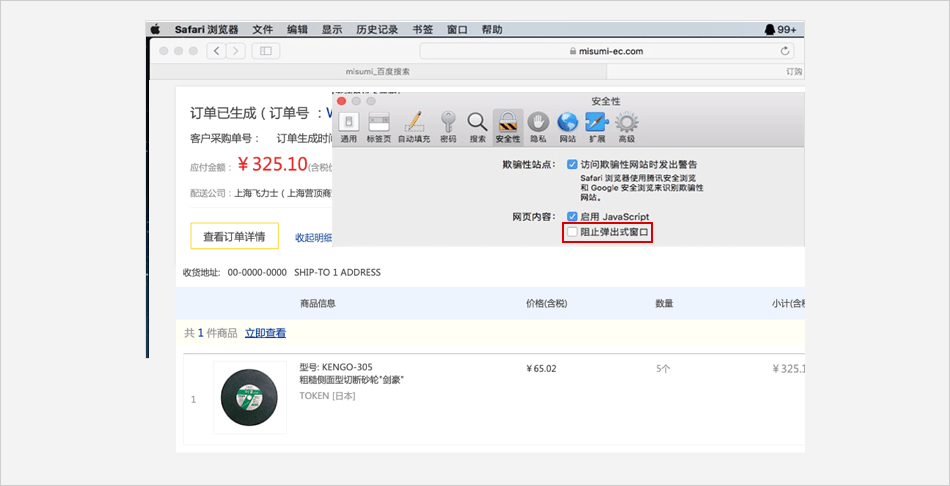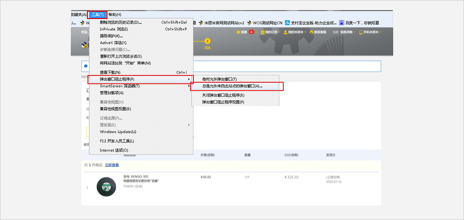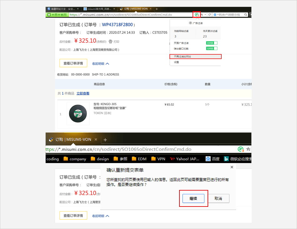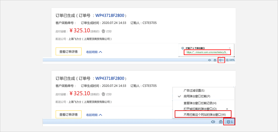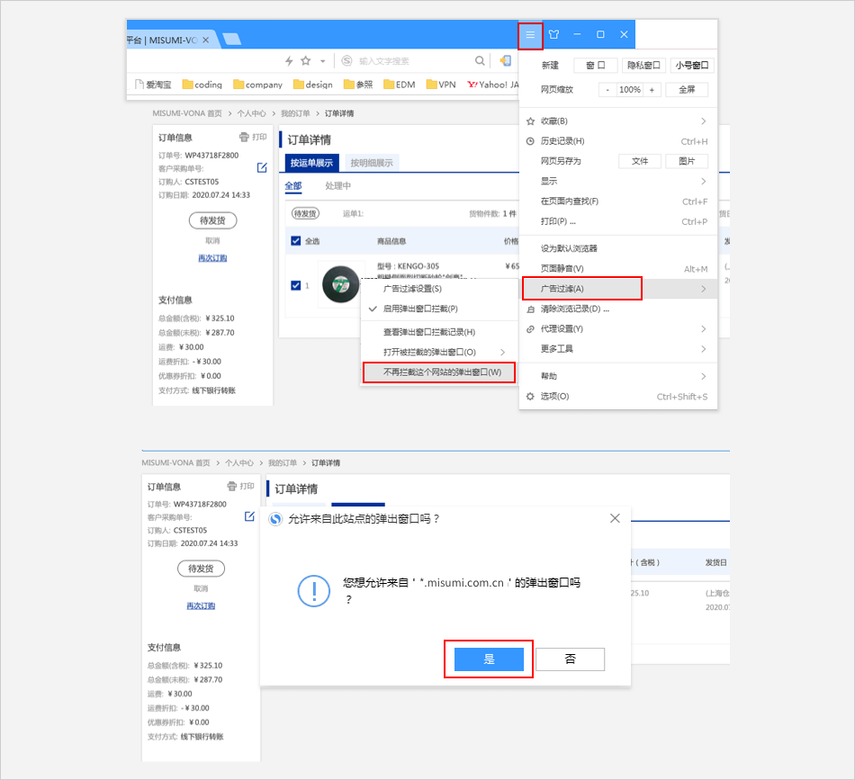 选择【广告过滤】⟹ 去除对【弹出广告拦截】的勾选⟹ 米思米网站上点击【付款】进行支付。