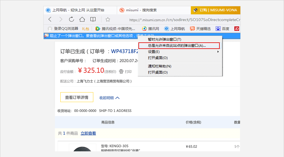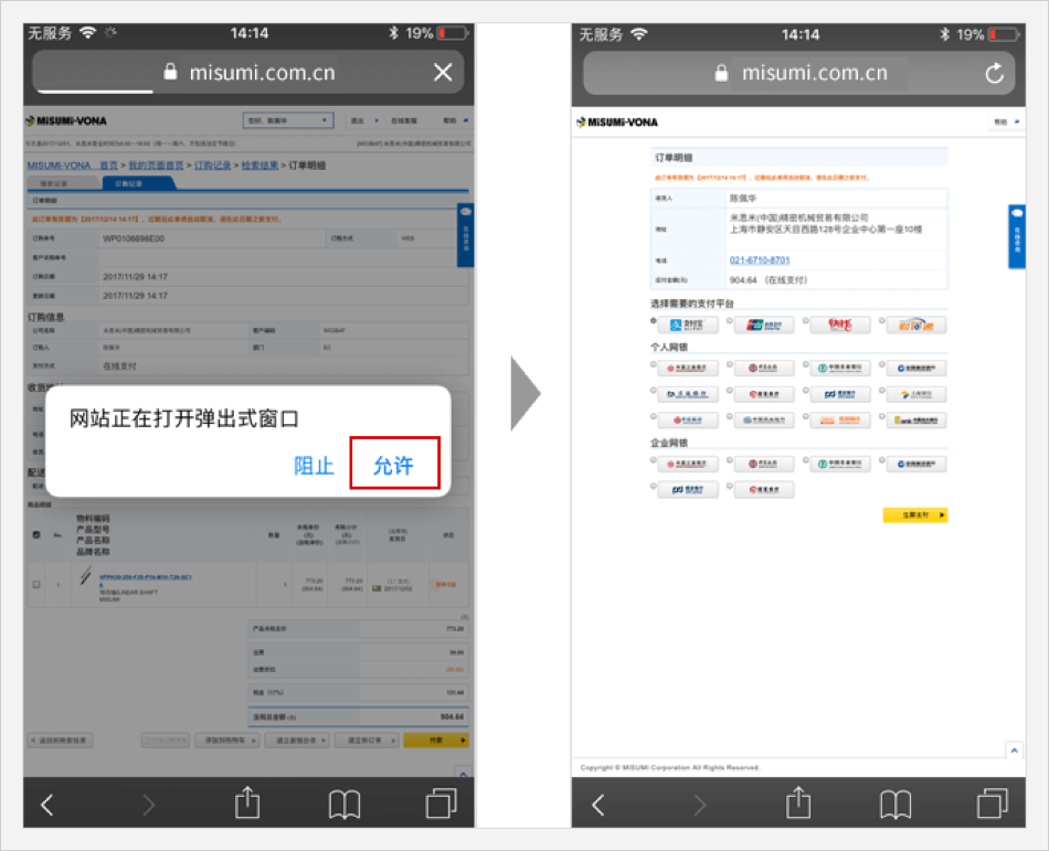 打开浏览器进行订购并付款 ⟹ 页面会出现弹窗提示 ⟹ 点击 【允许】 即可进行付款。