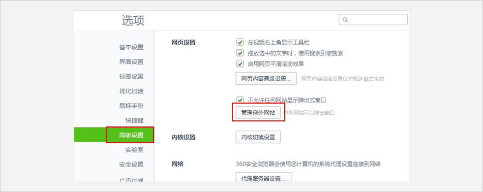 在左侧列表中 ⟹ 点击【高级设置】 ⟹ 再点击【管理例外网站】。