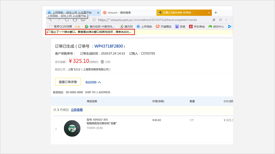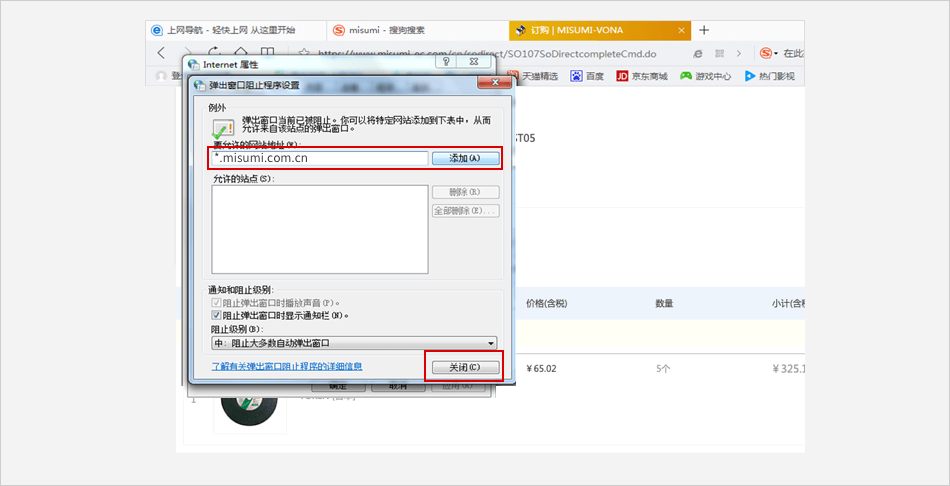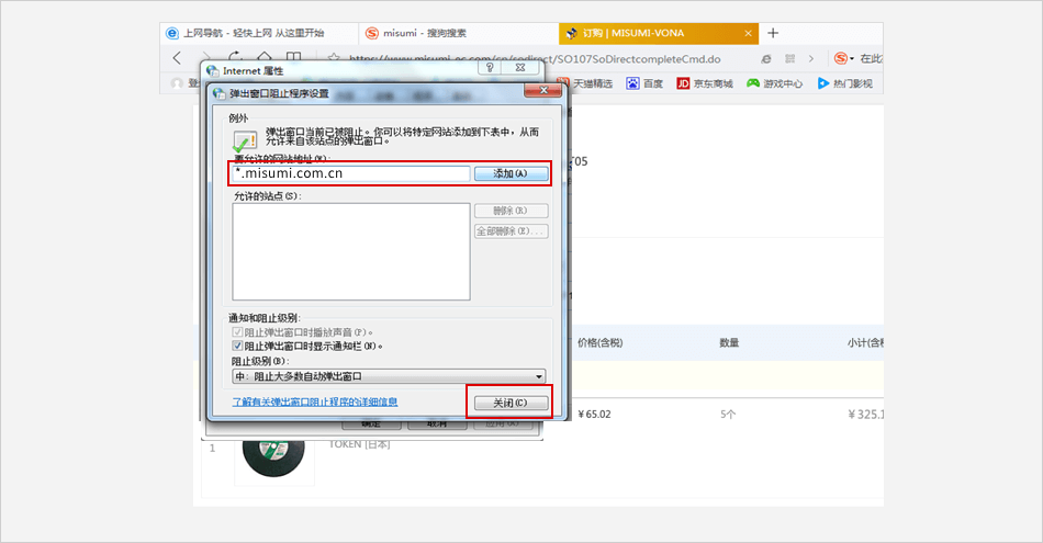 “要允许的网站地址”中输入米思米网址:www.misumi.com.cn,点击【添加】按钮后关闭选项卡即可。