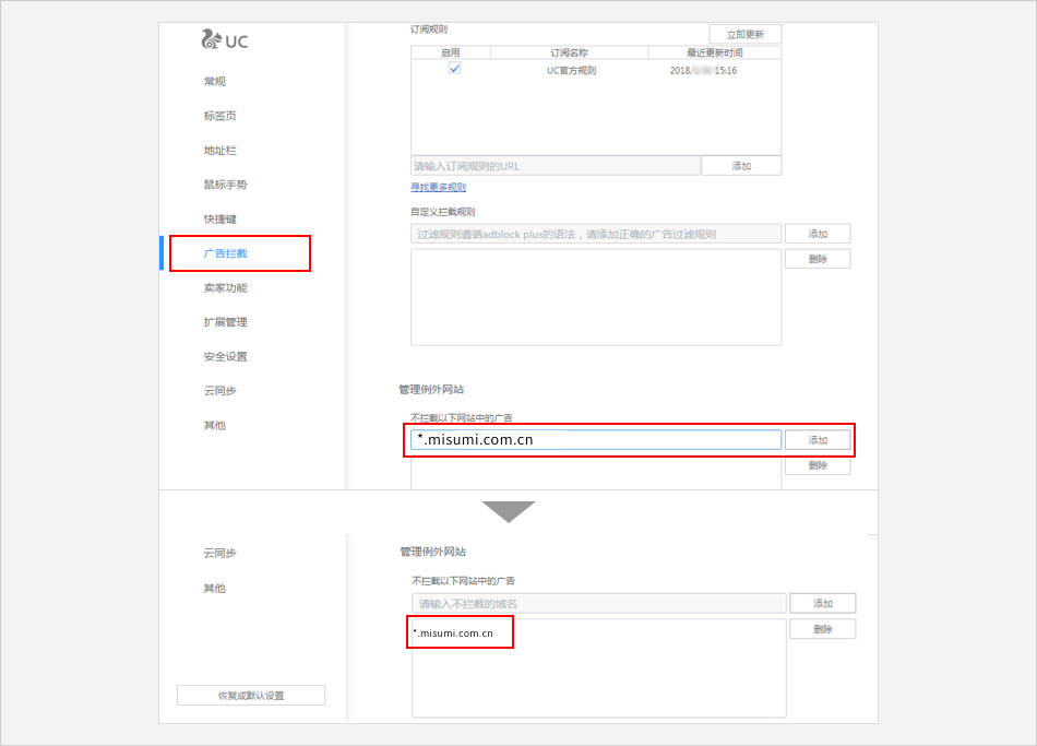 点击 【广告拦截】 ⟹ 在右侧的页面中 【管理例外网站】 下方的输入框中输入米思米网址:www.misumi.com.cn ⟹ 点击 【添加】。