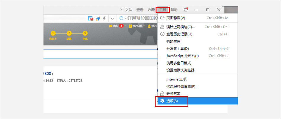 点击浏览器上方的 【工具】 选项卡(找不到工具,点击键盘ALT)⟹ 单击下拉菜单中找到 【选项】。