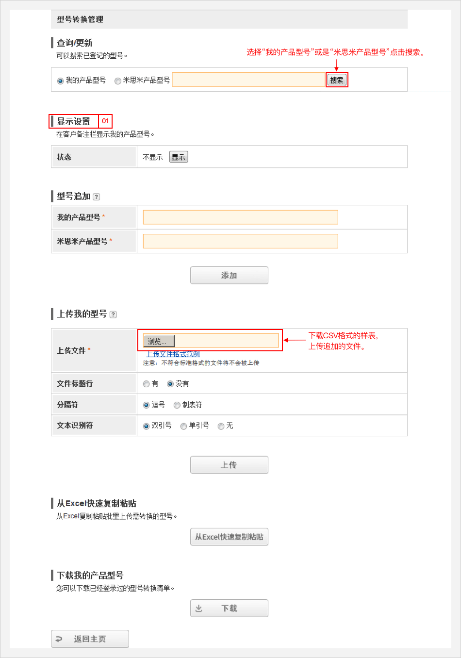 系统将会自动将您公司的内部型号转换为米思米的产品型号。