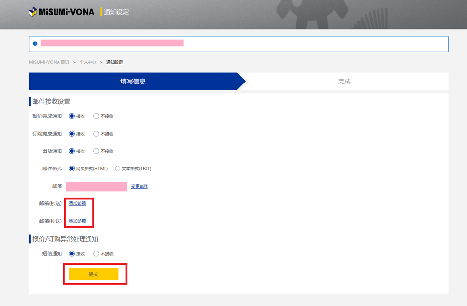 3.设置信息,设置完毕后点击【提交】。(如果您需要添加抄送邮箱,请点击【添加邮箱】,最多可添加两个抄送邮箱。)