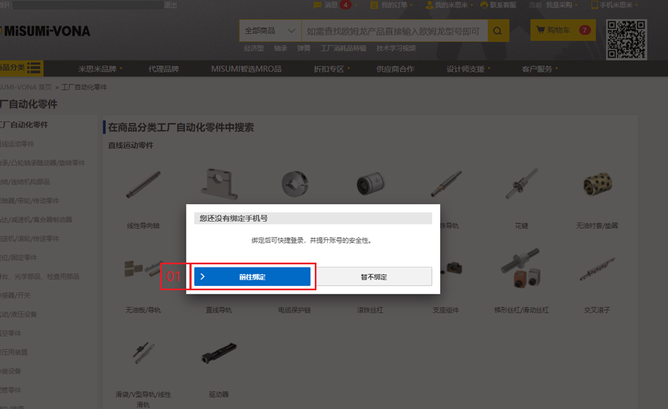 入口一:老用户登录米思米官网后,页面会出现弹屏提示,点击【前往绑定】即可进入绑定页面。