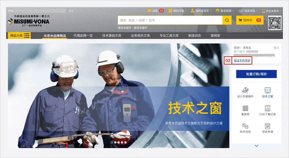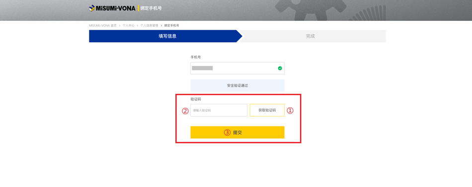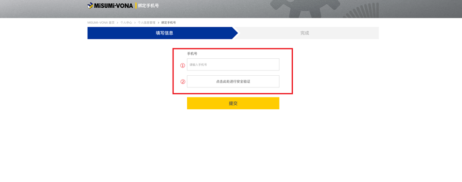 入口二:老用户登录米思米官网后,点击米思米官网首页【验证手机号码】即可进入绑定界面。
