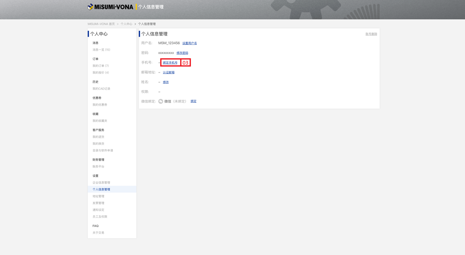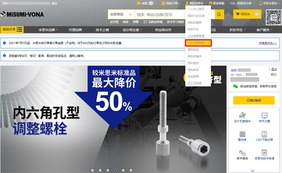 入口三:①老用户登录米思米官网后,点击米思米官网首页【我的米思米】-【个人信息管理】。