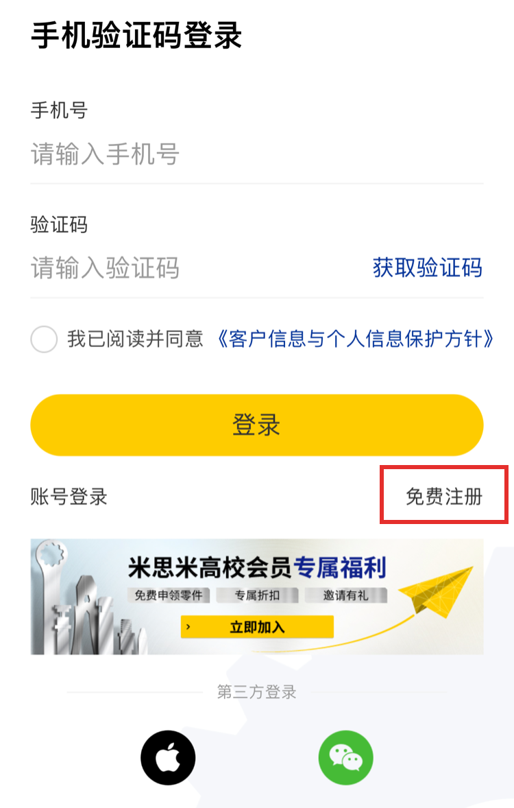 1.点击米思米首页【免费注册/登录】